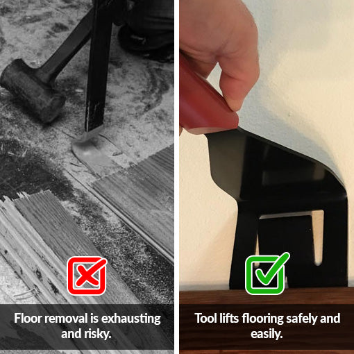 A: Yes, the Floor Lifter can remove glued-down vinyl. The integrated center wedge is designed to break adhesive bonds through aggressive extraction. For heavily glued vinyl, use a dead blow mallet or hammer to tap the tool through the adhesive layer, this wedge action helps separate the material from the surface underneath. Once the bond is broken, the tool's wide surface allows you to work along the length without concentrating stress at one point.