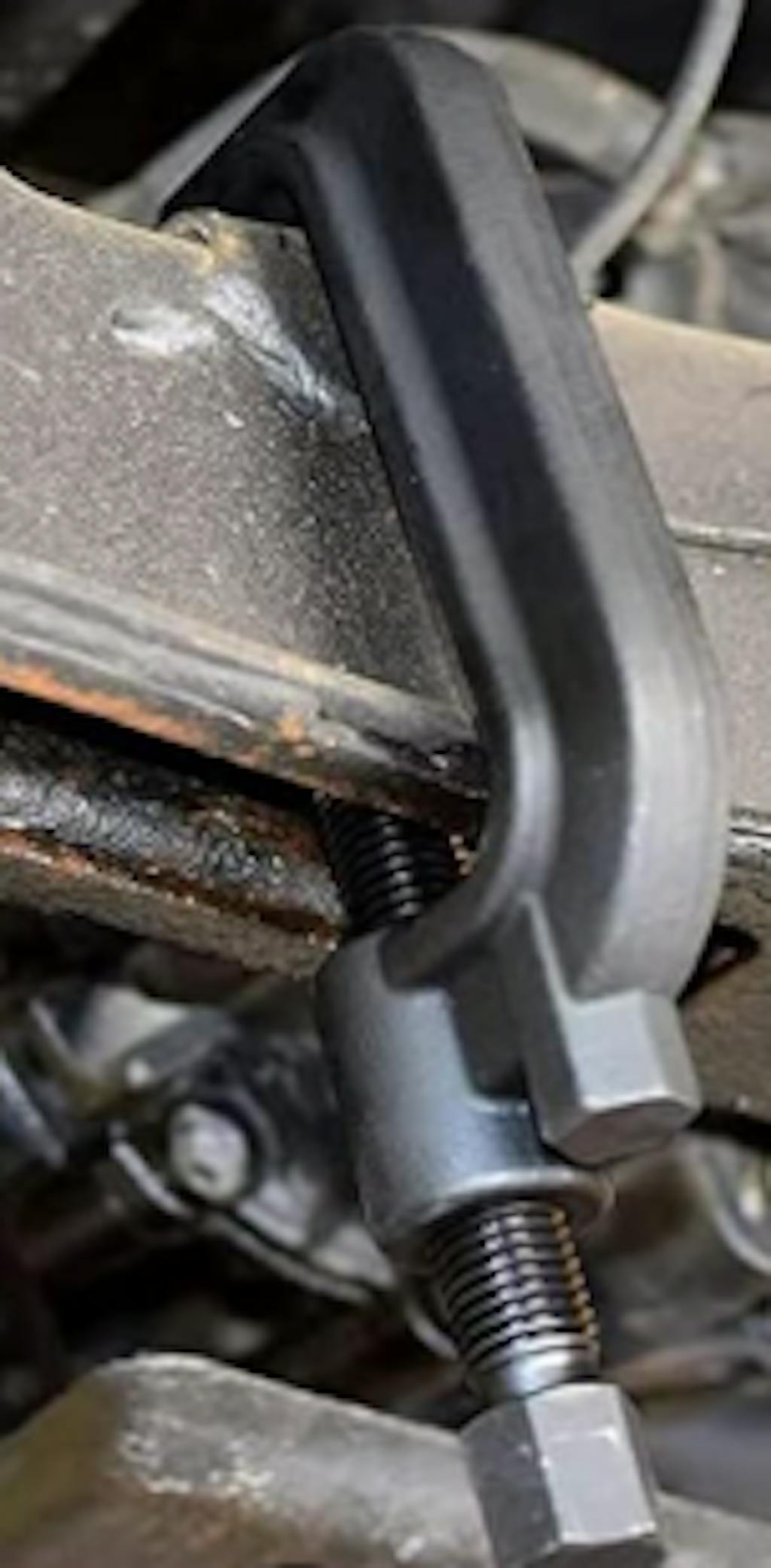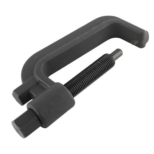 A: The Heavy Duty Torsion Bar Unloading Tool features forged steel construction and a large C-frame opening designed for heavy-duty chassis and beefier torsion bars. Its 7/8-inch diameter threads are larger and more durable than standard tools, while the drop-forged design provides superior strength for demanding truck applications. The tool's mechanical operation allows it to be safely positioned on both the frame and torsion bar mount for secure adjustments.