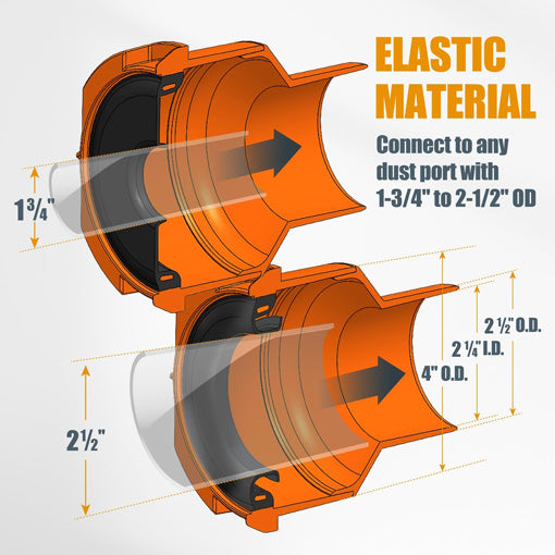 Compatibility: Fits 1-3/4"–2-1/2" tool ports and connects to 4" or 2-1/2" dust hoses, compatible with DeWalt, Bosch, Makita and other popular brands; suitable for saws, routers, sanders, and planers.