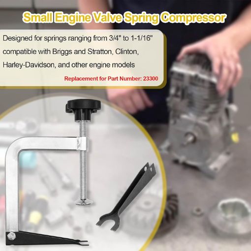 A: Small Engine Valve Spring Compressor works with many small engines, including Briggs and Stratton, Clinton, Harley-Davidson, and other engines with springs from 3/4" to 1-1/16".