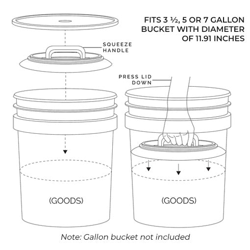 A: Yes, the Universal Bucket Insert Airtight Lid is ideal for fermenting and pickling. It features a built-in degassing valve that safely releases gases from fermenting or fresh goods, allowing you to "burp" your brined vegetables or fermented foods effortlessly while maintaining an airtight seal. The plunger system pushes out excess air for optimal preservation, and the BPA-free food-safe design makes it perfect for any pickling or fermentation project.
