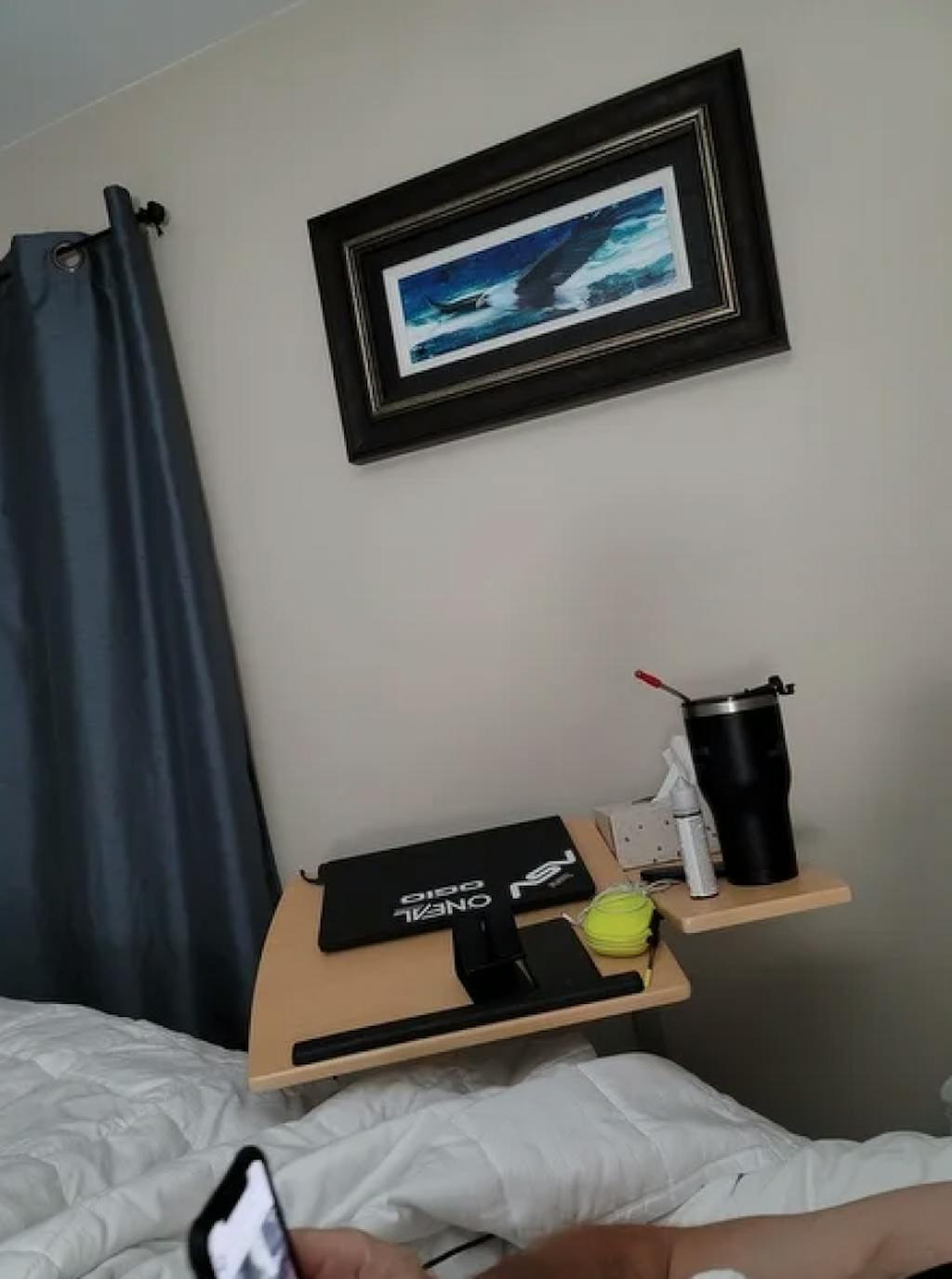 Working from home had me lying in bed all day which made me buy this bedside table. What I like about this is it's adjustable, so I haven't experienced any arm strain when working on my laptop for long hours because I can just adjust the height and angle.