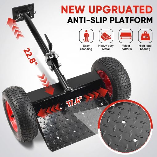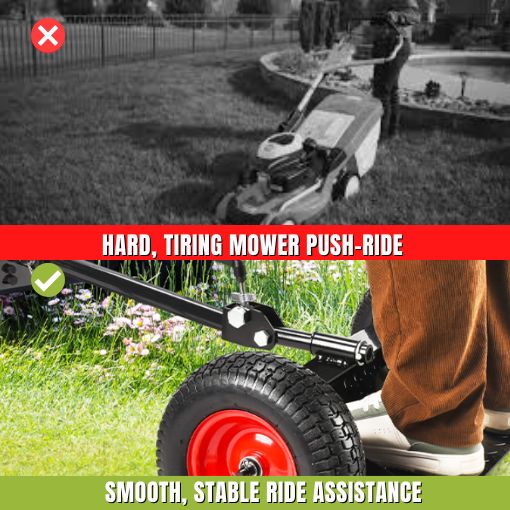✅ Mow Faster & Reduce Fatigue: Walking behind a mower slows you down and strains your back. This sulky lifts your mower, letting you ride and move smoothly, saving time and energy. Its large tires easily handle uneven terrain, making mowing more efficient.