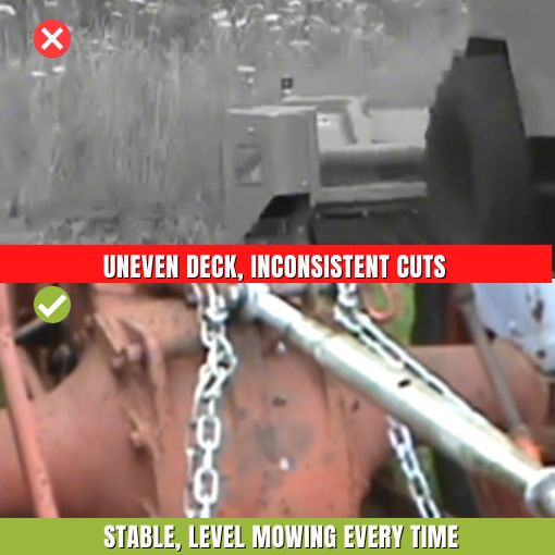 ✅ Maintain Consistent Deck Height: Many mower owners struggle with uneven grass cuts caused by deck bouncing or tilting on slopes and rough terrain. This stabilizer kit keeps the deck level during operation, preventing scalping and ensuring uniform grass height. Adjustable chains (36.5 inches each) and mounting brackets allow precise tensioning to suit different deck sizes and terrain conditions.