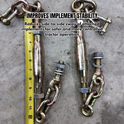 Reliable Implements Stabilizer: Never deal with wobbly attachments again. These stabilizer chains provide unmatched stability for your tractor implements, making mowing, tilling, or digging safer and more efficient. Heavy-duty construction ensures they withstand daily use.