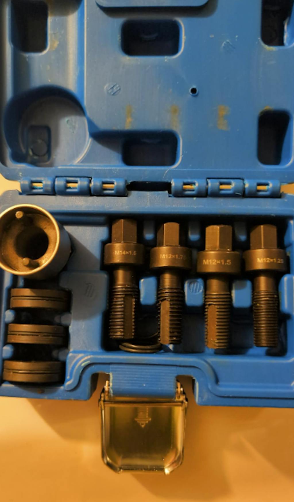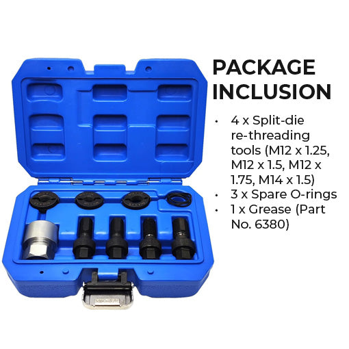 - 4 x Split-die re-threading tools (M12 x 1.25, M12 x 1.5, M12 x 1.75, M14 x 1.5)